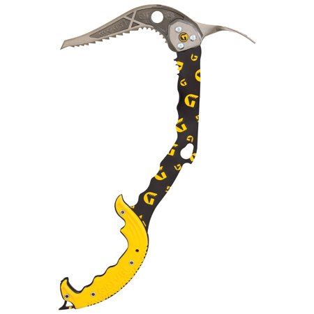 All the accepted rules about climbing equipment were upset during the 2004-2005 season by Monster. Lots of Grivel competitors tried to stop this stampede even using underhand methods. But the concept was right and today the less extreme X Monster has arrived. The shaft is slightly straighter and the grip is better for vertical walls. The flexible shaft that so many climbers have recently discovered makes anchoring into cracks, including non vertical ones, easier and safer. Just remember the progress made on changing from rigid to flexible vaulting poles! The rear is almost a hammer shaped like ?nuts?, ideal for anchoring and torquing in larger cracks on mixed terrain or with the a more classic shovel. A hole in the shaft can be used to attach a leash. Tiny anti slip claw at the end of the shaft. CE certification as a category 2 PPE.